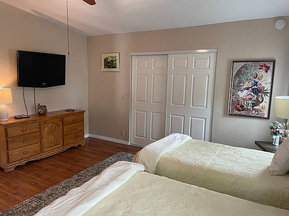 Welcome to this immaculate, move-in ready home featuring beautiful landscaping and a freshly painted stucco exterior. The spacious two-car garage provides ample parking and storage. Step inside to a formal living and dining area, enhanced by two skylights that fill the room with natural light. The double-door entry to the master suite leads you into a private retreat with a luxurious en suite bathroom and a large walk-in closet. On the opposite side of the home, you'll find the guest bedroom with a queen bed and double closet, a full guest bath, and a spacious laundry room with abundant storage. At the heart of the home is the open great room, combining the updated kitchen, dining, and family room-all with breathtaking views of the lake. The kitchen features stainless steel appliances, Corian countertops and sink, and an oversized butcher block island with seating for four-perfect for entertaining. Relax and enjoy the scenery from the fully enclosed lanai, which opens onto a dedicated grilling area. Additional features include 1" blinds on all windows, laminate flooring throughout (with tile in the bathrooms), and high-end furnishings included in the sale. This home is immaculately kept, stylish, and comfortable-a true touch of luxury with a view that simply can't be beat. Don't miss the opportunity to make it yours!