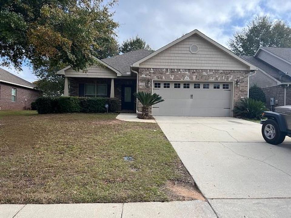 Brick home, double car garage, vaulted ceilings, kitchen with island includes dishwasher, stove, microwave and refrigerator, LVP flooring throughout, ceiling fans, fenced yard, covered patio, community pool and fitness center. Magnolia Springs subdivision off Schillinger/Silver Pine behind new Publix