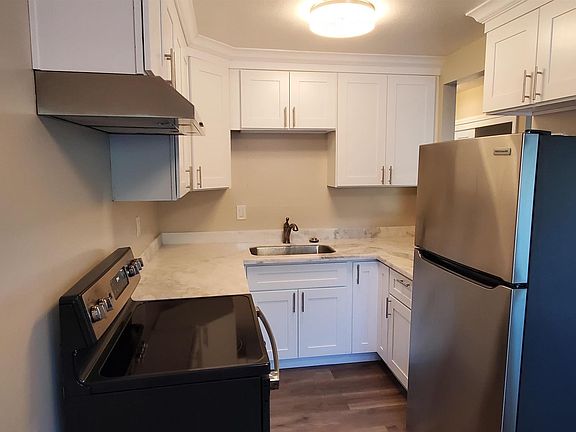 Downstairs end unit completely remodeled in 2022. with new Kitchen, bath, floors, bath tub, shower enclosure, fixtures, stainless fridge & stove, marble counters, new A/C, new plugs & switches etc. Community laundry shared with 4 units. Sorry no pets. Ready to move in.