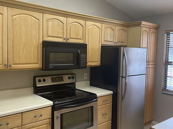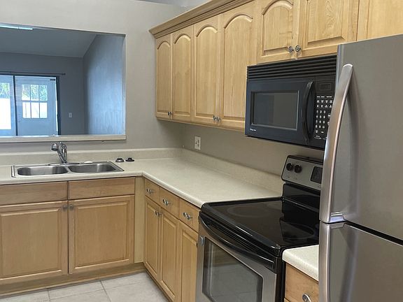 Entry opens to your Large Vaulted ceiling in the living room, open kitchen plan, new LED lights, tile floors throughout, no carpet to vacuum. Large bedrooms with nice refurbished bathrooms. Unit has a washer dryer located inside. Both bedrooms and the living room have ceiling fans and light kits. Property has an outdoor storage unit as well as a dedicated parking space. Enjoy your large community pool! Crown molding in kitchen, stainless refrigerator and stove, clean!