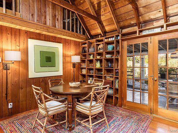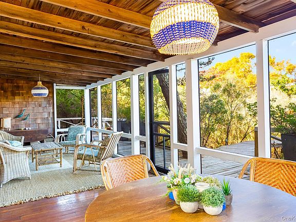 One of a kind shingled cabin with captivating screened porch ideal for end of day cocktails and long al fresco dinners. The first floor open living / dining area features polished oak floors, woodburning fireplace, built in bookshelves, paned floor to ceiling windows & classic French doors. A large primary suite with ensuite bath and private terrace overlooking the Great South Bay. 2 additional guest rooms and 2 additional baths.