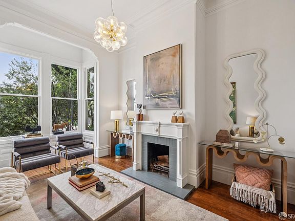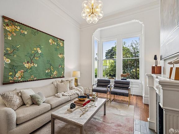Perched atop the vibrant Divisadero corridor, 223 Divisadero is a beautiful Victorian built at the turn of the century. Behind the pretty faade with ornate details are soaring ceilings, intricate woodwork, and Douglas fir floors throughout. The formal living room is framed by a bay window, moldings, and a wood-burning fireplace, open to an elegant formal dining room. A skylight brightens the center hall, leading to a stylishly renovated kitchen with quartz counters, sleek tile backsplash, deluxe appliances, and the home's original brick hearth. Off the kitchen are enclosed stairs down to the garage, as well as a ladder leading to over 400 sq. ft. of (bonus) attic with tall ceilings and windows/skylights! The front bedroom boasts a fireplace and oversized windows, and the ensuite bath is outfitted with a glass-enclosed shower. A middle bedroom offers dual closets, and the generous rear primary suite includes 2 walk-in closets, an attractive bath with shower over tub, and direct access to the lovely, landscaped backyard. The 4-car garage houses laundry and storage, with expansion potential in both the garage and attic. Located just 2 blocks from Buena Vista Park and a short stroll to Duboce Park, Golden Gate Park, Alamo Park, cafes, and wine bars on Divisadero and Haight St.