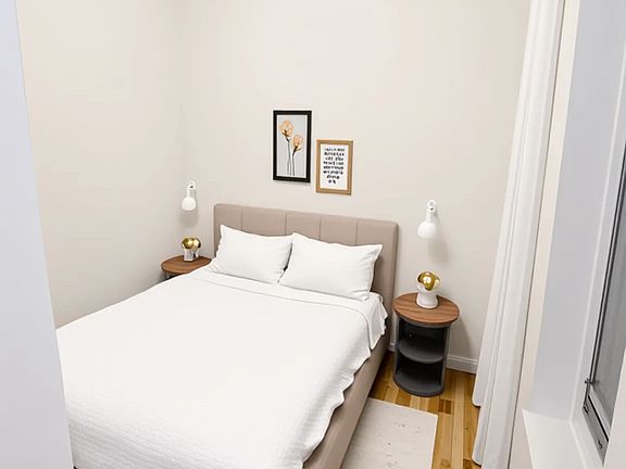 1 bedroom apartment that accommodates a queen size bed and comes with two built-in closets. The bathroom has a bathtub.