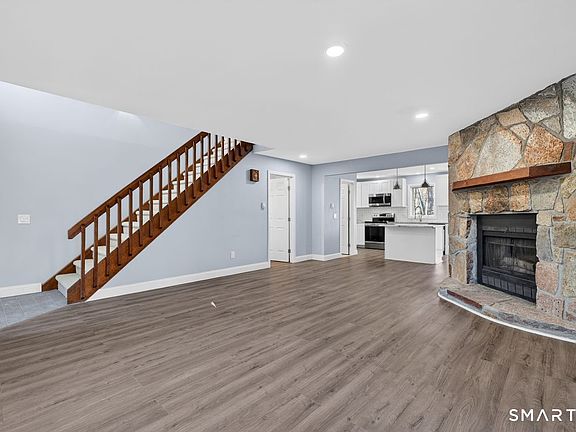 Welcome to this beautifully updated townhouse in the 16-home Briarwood Estates Association! Enjoy a spacious open floor plan with wide plank flooring and a stunning fieldstone wood-burning fireplace in the living room. The remodeled kitchen features shaker cabinets, granite countertops, pantry, and opens to a large private deck-perfect for entertaining. A bright den with cathedral ceiling and built-ins, plus a remodeled half bath, complete the main level. Upstairs includes two light-filled bedrooms. The primary suite offers a walk-in closet and Juliet balcony. The heated basement space is ideal for an office, gym, or media room. Move-in ready and full of charm! Minutes to downtown, Niantic Boardwalk, area beaches, restaurants, & shops.