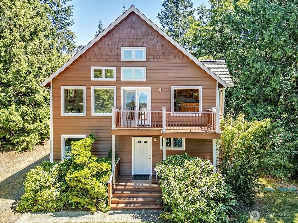 Views of Protection Island out to the Straits of Juan de Fuca topped with Dungeness Light House from this delightful home tucked away on half-acre in Cape George. Live at the dead end of Huckleberry Place, a private street with access from Cape George Road. The green belt and the trail to the beach are at your doorstep. Mature Rhododendrons, partially fenced & treelined for privacy. First floor has a bedroom, bath and den/office. Upper floor has the living room, kitchen, dining, a bedroom with loft and a full bath plus an extra sink. Amenities-pool, marina, weight room, club house, pickle ball court and a mile of private beach. Side deck is new 2023, exterior painted in 2024. Roof has been cleaned & treated in 2025. Septic inspected 2025.