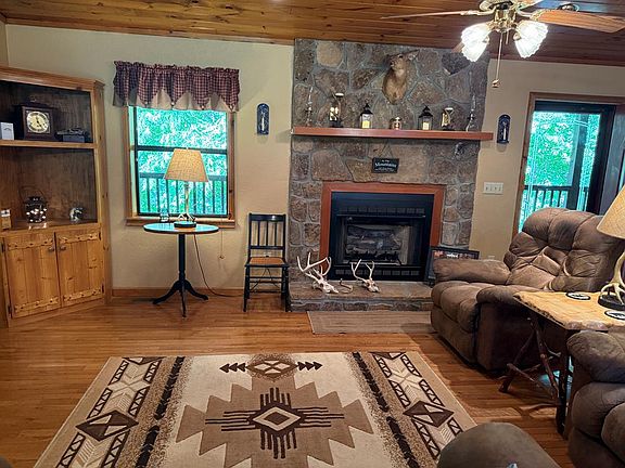 Escape to this charming log-siding cabin, nestled on 2.29 UNRESTRICTED acres of gentle laying land, offering a rare combination of comfort, privacy, natural beauty and abundant wildlife. Upon entering, you'll be greeted by the warmth of hardwood floors that run throughout the home, cathedral ceilings complemented by a stunning stone-front gas-log fireplace that serves as the focal point of the living room. The open-concept layout flows seamlessly into a well-appointed kitchen, making it the perfect space for family gatherings and cozy evenings. With the master bedroom and ensuite bath on the main level, this home provides ample space for both relaxation and entertaining. A guest bedroom and bath complete the main level. The home also features an unfinished basement includes a full bath and laundry area, wired for a generator ,offering potential for expansion, storage, or a personalized workshop. The level terrain of the property allows for easy outdoor enjoyment. The expansive front porch and manicured lawn is surrounded by mature landscaping that enhances the home's private and serene setting. A circular driveway leads you to the detached garage, which includes floored attic space for storage. The property also has a private well, ensuring convenience and self-sufficiency. Enjoy seasonal views of Lake Chatuge and the surrounding mountains from the property, offering the perfect backdrop for quiet mornings or evening sunsets. The home is ideally located, just a short distance from a public boat launch and marina, making it perfect for boating and outdoor enthusiasts. Centrally situated between Hiawassee, GA, and Hayesville, NC, you'll enjoy the best of both small towns—seclusion with easy access to local restaurants and shopping. This log-cabin retreat offers the ideal combination of privacy, comfort and location. Don't miss out on the opportunity to make this picturesque home your own.