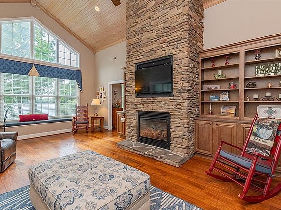 Enjoy breathtaking lake views from multiple vantage points throughout this stunning custom-built home in Tarawood. The welcoming entryway features rich wood floors and opens into a spacious living area with soaring cathedral ceilings finished in beautiful pickled wood. A cozy gas-log fireplace enhances the warm, inviting ambiance. The Gourmet kitchen is a chef's dream, boasting granite countertops, tile backsplash, black appliances, a gas cooktop, a built in wine rack, and matching pickled wood ceilings. With 4 bedrooms and 3.5 baths this home offers ample space for family and guest. The walk out basement features the 3 bedrooms, 2 full baths, kitchenette, and comfortable living-room with a charming buckstove perfect for entertaining. Outdoor living is just as impressive with screened porches and deck and a patio by the water complete with hardwired gas line for grilling. Paved walkway leads to a private U-shape floater, all surrounding by a beautifully landscaped grounds.