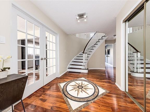 Don't miss this chance to make 223 River Oaks Blvd W. your new home! This beautiful 4-bedroom, 2.5-bath family home sits in the heart of the desirable River Oaks community. A family-friendly neighborhood known for picturesque trails of Lions Valley Park, excellent schools including White Oaks H.S., and convenient access to the Oakville Hospital, River Oaks Recreation Center, parks, highways, Oakville Go Station, and everyday shopping. A spacious foyer with a sweeping spiral staircase introduces the main level, leading to formal living and dining rooms with walnut hardwood floors and French door access to the kitchen. The bright kitchen offers ample oak cabinetry, and the breakfast area flows seamlessly to a composite deck, perfect for outdoor dining, entertaining, or simply enjoying the meticulously landscaped private backyard with plenty of green space for children and pets. The family room, featuring a stone wood-burning fireplace, creates a warm setting for relaxing evenings. Added features include a main-floor laundry/mudroom, side door access, a 2-piece powder room, and an inside entry to the double-car garage. Upstairs, you'll find four generously sized bedrooms, including a primary suite with a walk-in closet and a 4-piece ensuite bath. Three additional bedrooms share another full bath, offering flexibility for family, guests, or home office needs. The large unfinished insulated basement with bath rough-in provides endless potential, a blank canvas ready to transform into a recreation area, gym, or guest suite you've always wanted. Upgrades include a 200-AMP main electrical panel with a Siemens surge-protected device, two subpanels, one garage 80-AMP (ready for EV) and backyard 50-AMP, exterior potlights, and front and back in-ground sprinkler systems. Located in one of Oakville's established neighborhoods, this home offers comfort, functionality, and convenience with easy access to local amenities.