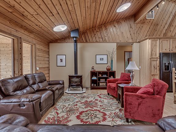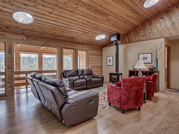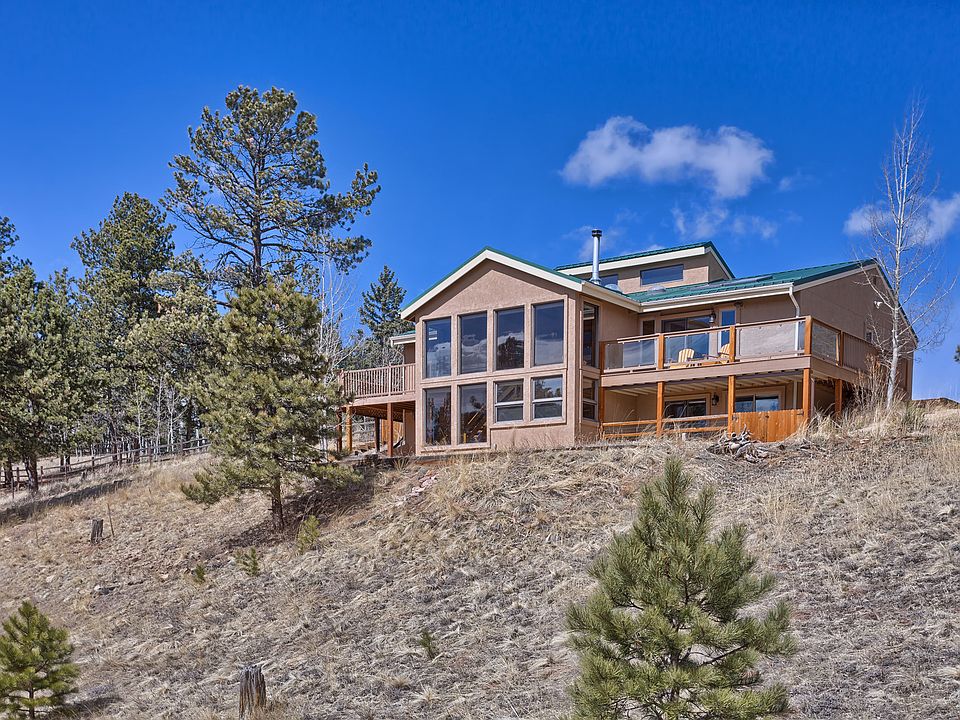 This is an unbelievable mountain home with amazing Pikes Peak and mountain views! Flag lot means home is set back off the road for wonderful privacy. Asphalt driveway with extra parking space is easy to clear. Stucco siding for low maintenance and metal roof with snow mitigation system and gutter shields. Bright and open main level living w/vaulted wood ceilings and wood laminate floors makes it a warm & inviting mountain beauty. Trees all the way around and open meadows to the back allows for a very picturesque property.
