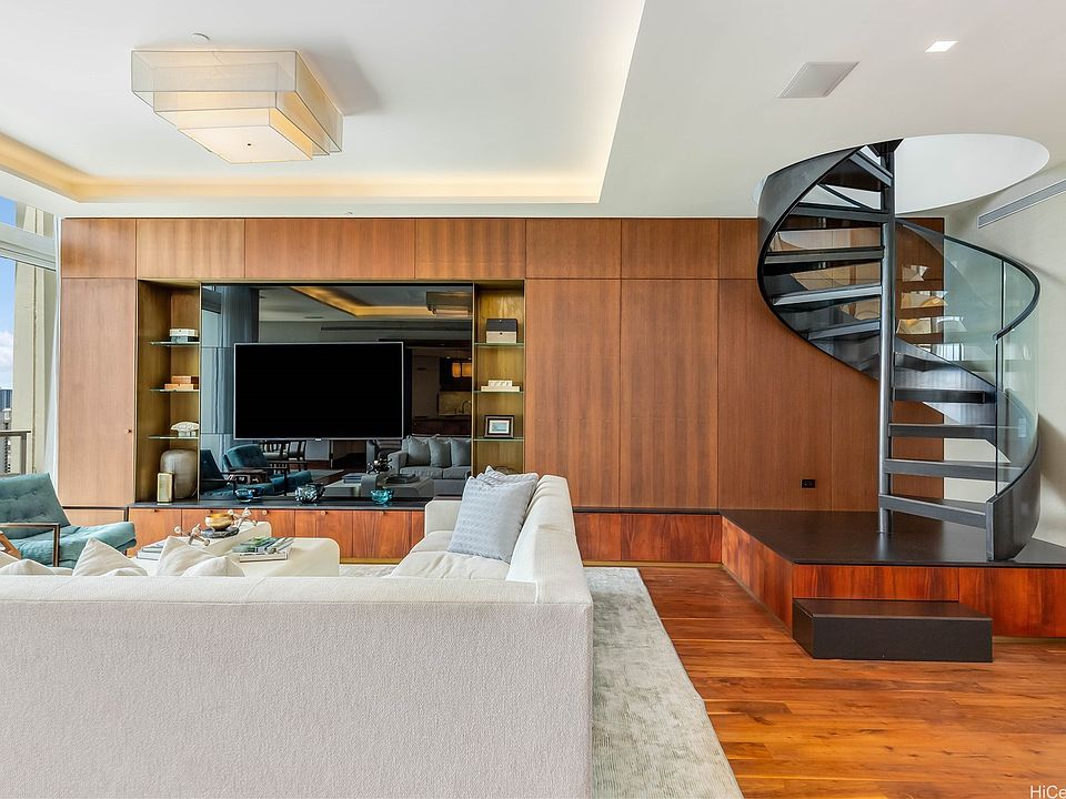 This rare Penthouse features 10-foot ceilings, floor-to-ceiling glass, and sweeping, unobstructed ocean views that define world-class island living. Beautifully furnished with custom, high-end designer pieces, the residence blends refined comfort with contemporary elegance. The open living area highlights sophisticated wood paneling, premium finishes, and a dramatic spiral staircase leading to your exclusive private rooftop terrace with a plunge pool, Jacuzzi, and built-in BBQ—an amenity seldom available in Waikiki.