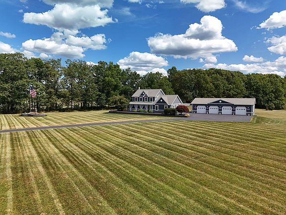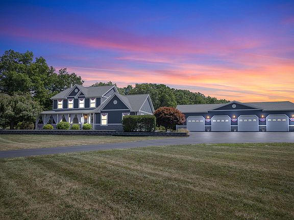 This breathtaking colonial 3 bedroom 3 and 1/2 bath home is situated on more than10 acres of beautiful, manicured lawn in a private rural setting. The amazing improvements the owners have made are over the top! The entire house has luxurious ceramic tile and ceramic plank flooring. The in-floor radiant heat keeps the floor cozy warm on the coldest winter days, and the air conditioning keeps you cool on the hottest summer days. The entertainment room was remodeled in 2020 with Ceramic Plank tile, Quartz stone wall, matching Quartz built in large screen Tv and Fireplace, custom built bar and cabinetry. The updated stylish functional kitchen has an abundance of cabinet space and wraps it together with the elegance of granite counters, complemented by a luxurious backsplash of glass tile. Compete with a breakfast area with a view of the scenic back yard and access to the rear patio. the formal dining area leads to the cozy living room. The primary bedroom is well-designed and luxurious. A closet, with plenty of space and a private bathroom with double sinks, double cabinetry. The heat is zoned just for the bathrooms on the chilly morning when you don't want to heat the entire house, a sliding patio door leads to a private 2nd Floor 12' x 12' Deck overlooking the back yard. The convenient 2nd floor laundry center and central vac lighten up the chores in this nearly 3000 sq.ft. of living space. The finished basement, with the convenience of a full bathroom, can serve multiple purposes, like home office, home gym, or guest room. The garage is one-of-a-kind! The attached 4 car garage features a full kitchen and a ½ bath with a tankless water heater, sectional sofa set-up living room with a large screen TV, epoxy coated floor, work bench and cabinetry for storage. A new addition was built in 2023 that features 5 large windows,72" French exterior doorway, a full stone wall with fireplace, a 2nd large screen TV, a 2nd full living room or home office that is heated and air conditioned. In 2023, the home received new vinyl siding, a stunning front door with sidelights, a sliding patio door, and updated trim, enhancing its exterior appeal. It features a breezy L-shaped front porch, a huge16' x 32' deck for grilling and entertaining, and an 8' octagonal gazebo with vinyl railing, providing a perfect setting for guests to relax and enjoy the surroundings. The layout of these outdoor structures allows for breathtaking views of the sky, whether it's a bright blue day, exquisite sunsets or a starry night. The landscaping surrounding the house and garage is expansive and attractive. There is a tranquil water garden filled with koi goldfish, along with a fountain and a waterfall. A large flagpole, which supports a 12'x18' American flag, is also surrounded by a matching decorative stone wall, adding to the property's charm and beauty. An Expansive Industrial-Grade Garage ideal for automotive, storage, or workshop use. Spanning a robust 40x128 feet, this facility boasts a 16-foot ceiling, providing ample vertical space for any project or storage need. Equipped with six 12x12-foot doors, this garage ensures easy access and accommodation for larger vehicles and equipment. Three 36-inch man doors provide convenient entry points. 220-volt electric service, Two hanging heaters, each at 250k BTU, ensure a warm workspace year-round. Perfect for the classic car enthusiast or any motor sport, this garage is a rare find. Don't miss the opportunity to make it yours. With over 10 acres, The paved driveways and parking lots are the icing on the cake although you won't want to leave the comforts of your charming estate once it's yours.