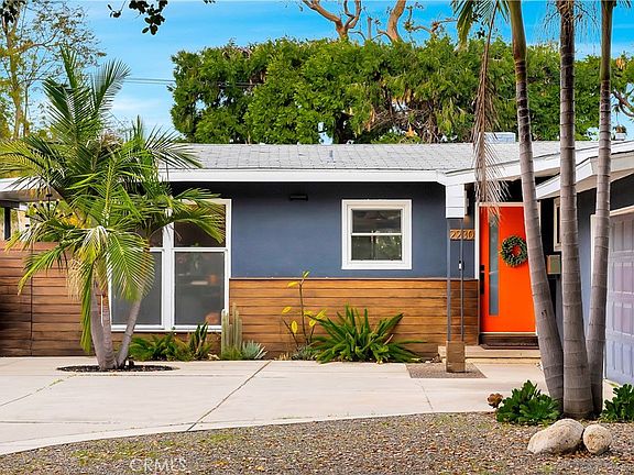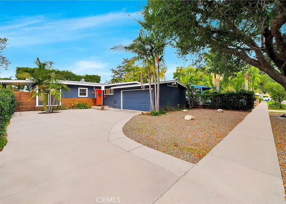 Embrace the epitome of mid-century modern with this meticulously remodeled 3-bed, 2-bath, single-story residence offering nearly 1,200 sqft of living space. As you enter through the front door, you'll be greeted by an airy open-concept living area with 12-ft cathedral ceilings and multiple thoughtfully positioned windows to maximize sunlight at different times of the day. The gourmet kitchen features stainless steel appliances, a Wolf induction cooktop, sleek European-style cabinetry, and an impressive waterfall island that will surely be the centerpiece of your culinary creations. Relax by the fireplace or entertain in your low-maintenance designer backyard, crafted for a seamless indoor/outdoor entertaining experience, equipped with a built-in BBQ and covered patio for year-round enjoyment. Additional highlights include a 2-car garage with the convenience of an EV charging station, perfect for the eco-conscious homeowner. The location is unbeatable—within walking distance to the River View Golf Course and Santiago Elementary and centrally located near the 5 and 22 freeways, making commuting a breeze. This property is a masterpiece of form and function, awaiting a discerning buyer who appreciates modern luxury and accessibility. Don't miss the opportunity to call this one-of-a-kind house your own