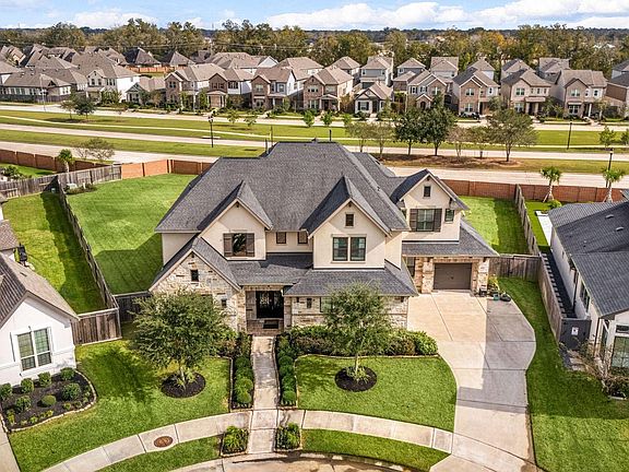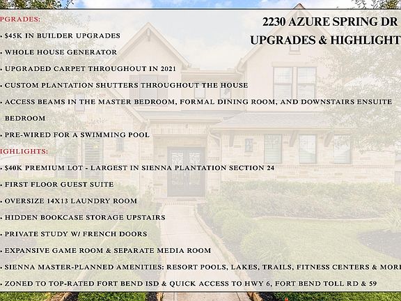 Sitting on a sprawling premium lot w/ $45k in builder upgrades, this standout Trendmaker home in Sienna blends rich finishes & thoughtful upgrades including a whole home generator, future pool pre-wiring, 2021 carpet & custom plantation shutters throughout. A grand foyer opens to a breathtaking tall ceiling living room flowing into a gourmet kitchen w/ SS double ovens, 36” pro 6-burner range, J-Kraft cabinets w/ under lighting & island made for hosting. Enjoy a private study, plus stunning wood beam ceilings accenting the guest suite, formal dining & primary retreat w/ an impressive bath featuring a centered tub, large walk-through shower, separate vanities & dual walk-in closets. Upstairs offers an expansive game room, media room & hidden bookcase storage. Enjoy a large covered patio w/ ceiling fan & a plethora of yard space offering unmatched privacy. Moments from Sawmill Lake Club, resort pools, trails, fitness centers & Fort Bend ISD schools, Hwy 6, Fort Bend Toll Rd & 59.