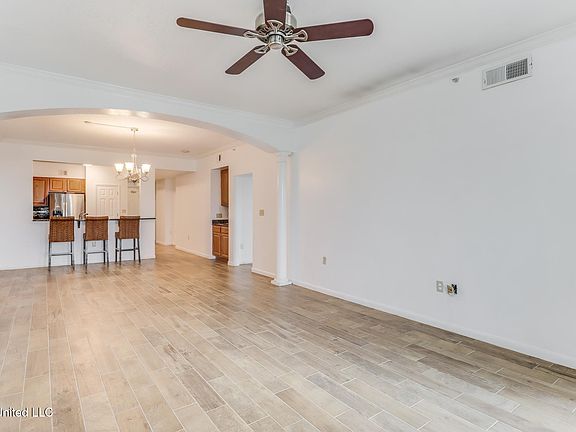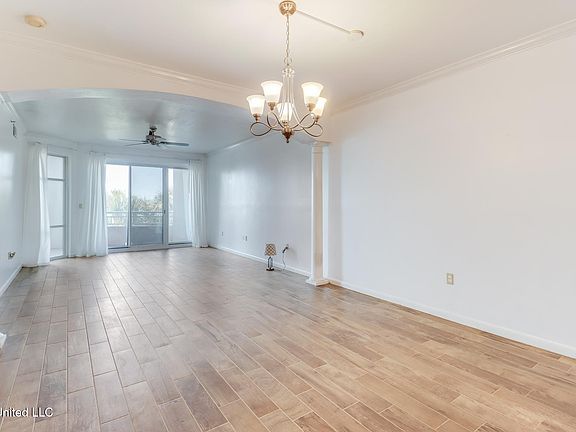 Welcome to this stunning 3-bedroom, 2-bath condo, perfectly situated along the scenic shores of the Mississippi Gulf Coast. Step inside to a spacious and inviting living area, featuring elegant arched ceilings with pillars and beautiful porcelain tile flooring that flows throughout the main living spaces. Crown molding adds a touch of sophistication to every room.
