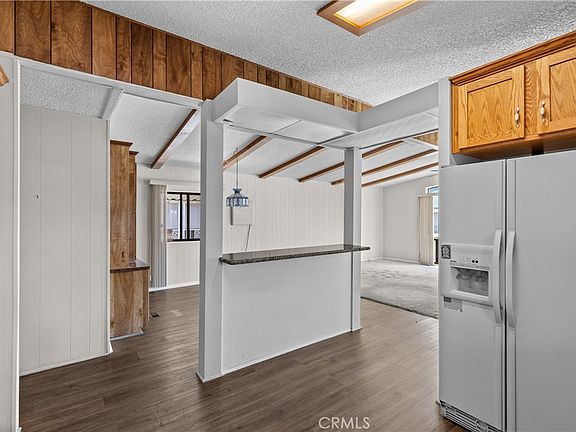 Located in the 55+ Soboba Springs at Lake Park community, this 2-bed, 2-bath home offers space, light, and plenty of opportunity to make it your own. The living room features an eye-catching A-frame window wall and vaulted ceilings with exposed beams that bring in great natural light. The kitchen provides ample cabinet space and updated stainless steel appliances, while the primary suite includes a walk-in shower and soaking tub. Enjoy the enclosed Arizona room, perfect for relaxing in this peaceful neighborhood. Additional highlights include a evaporative cooler, storage shed with a workbench, and extra storage space behind the home. Community amenities include a pond, clubhouse, and friendly neighbors, all set in a quiet San Jacinto location.
