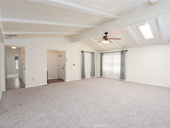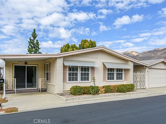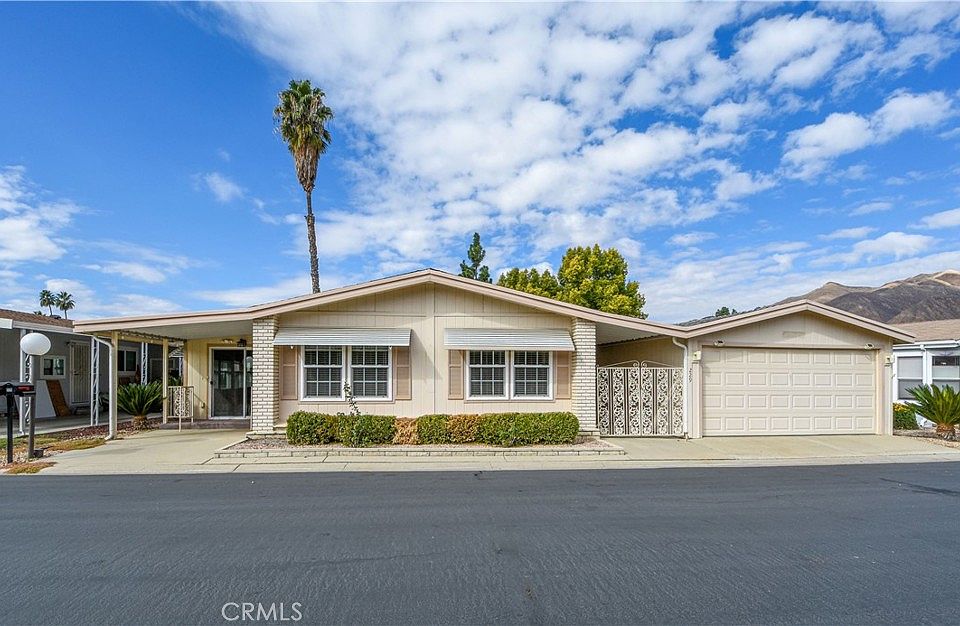 Open floor plan with soaring vaulted ceilings in living room. Beautiful natural light from skylights reflect on the newly white painted walls and ceilings. New roof installed in October and brand new carpet installed in November. Kitchen updates include LED dimmable lighting, new garbage disposal and painted cabinets. The kitchen's diner style booth adds unique charm. HVAC ducts professionally cleaned and HVAC/Electric systems inspected and in proper working condition. New smoke and carbon monoxide detectors in house. Bathroom updates included new shower fixtures, paint and flooring. Enclosed bonus room off the living room and an office full of cabinets, a built in desk and coat closet provide extra space for storage and creative pursuits. Wood paneled bar with sink and shelving offers a cool space for cocktail parties and entertaining guests. Detached garage provides more storage opportunities and protection for your vehicle. Spacious yard with awning, mountain views and prolific fruit trees offer a private outdoor sanctuary. Located in Soboba Springs Mobile Estates at the base of the San Jacinto Mountains; this 55 plus community is known for its tranquil lake and expansive greenbelts, and offers a wealth of amenities for its residents: Putting and chipping greens, a billiards room, craft room, pool, jacuzzi, sauna, library and game room. Turnkey with impressive upgrades, this may be the home you've been looking for.