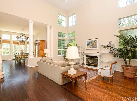 Mulholland Heights in Calabasas located at the end of a cul-de-sac! Double door entry leads to an elegant step down living room w/wood floors, fireplace, walls of windows of natural light, and recessed lighting. Formal dining room with wood floors, pillars, and doors opening to rear entertaining patio. Enjoy breakfast with mountain views, kitchen with pantry, wood floors, double oven, and center island. Stunning built-in cabinets in Family room with fireplace, and doors leading to rear grounds. Tiled counter wraps around to provide wet bar w/cabinets for dishes and a wine rack. One bedroom downstairs with a private bathroom and entry, smooth ceilings, recessed lighting, and wood floors. Double doors lead you to 2nd floor master bedroom with a fireplace, recessed lighting, smooth ceilings, wood floors, private bath with chandelier, large walk-in closet, tub and a shower. Three other bedrooms are located and 2nd floor with a hallway bath. Rear yard has a covered patio, grass area, mountain views, a pool with fountains and a spa.