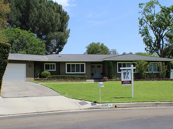 Beautiful secluded cul-de-sac location west of Topanga in desirable Chatsworth on a flat 18,800 square foot lot. This one level remodeled ranch home has it all. Double door entry leads to large living-room with brick fireplace and custom oak wood floors. Updated kitchen offers granite counters, stainless steel appliances, walk-in pantry and large dining area. Custom shutters and blinds though out. All bedrooms offer ceiling fans and mirrored wardrobes or walk-in closets. All three full baths have been updated and remodeled. Smooth ceilings and crown moldings enhance the country feel. One bedroom is off the kitchen with its own entrance and would be perfect for home office, maid, or guest quarters. Flagstone covered patio with fireplace and included flat screen TV overlook HUGE back yard with custom pool and spa, sport court, garden and fruit trees plus grass area. You do not find properties like this very often.