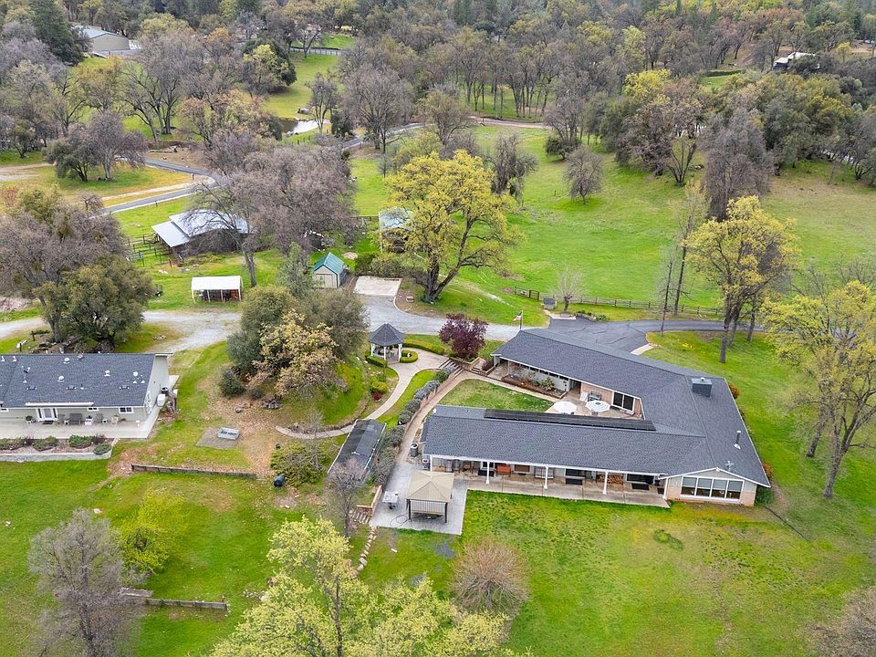 Country roads take you home to the place you belong in Sonora at 22309 Villas Lane, RANCHETTE WITH 2 HOMES AND OVER 5.5 USABLE AND GENTLE ACRES. Stunning Equestrian property with scenic water front views and studded with mature oaks!TWO ONE-LEVEL HOMES and a BARN on over 5.5 acres! You can swim, boat and fish here! The main home is +3400 sqft, 3 bedrooms, PLUS attached studio & 3 full baths with a 2 car garage while the appx. 1008 sf 8 YR OLD guest home has 2 Beds, 1.5 Baths, laundry room and oversized 2 car garage- both homes with generators and automatic transfer switches! There’s an RV carport with water/power, Gazebo on a stamped concrete patio with a hot tub, fenced raised garden with irrigation, chicken coop and fenced areas for horses, or other animals. The barn includes 4 stalls, and a finished office/tackroom with power. The main home has solar, upgraded pex plumbing by JHart, exterior paint, new Foothill Fireplace insert in the living room and a newer freestanding stove in the family room by Winters Stove Works. Other updates include roof, luxury vinyl plank flooring, remodeled master bathroom and water heater. The separate office/studio with full bathroom and could also be a guest or inlaw quarters. Don't miss this opportunity to own your own slice of heaven on earth!