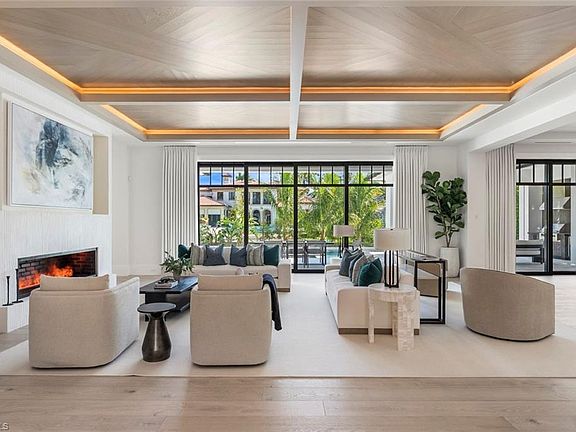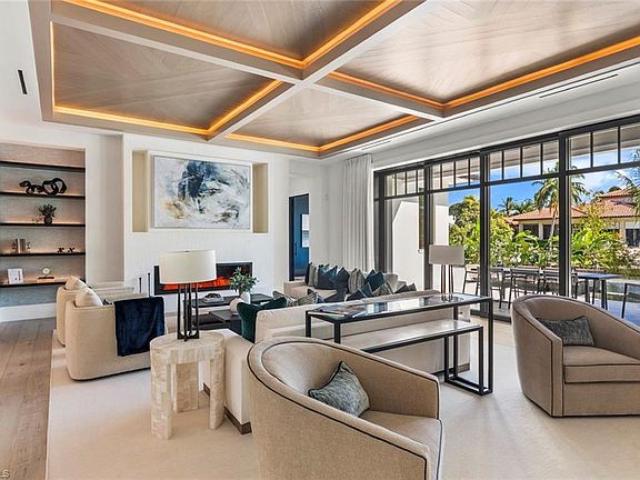This is Naples' only neighborhood that provides walk to beach, Third Street historic district, and direct boat access. Close to a hidden beach path, and tucked away in a private section of Aqualane Shores, this custom home was beautifully designed and furnished by Broad Avenue Studios, expertly crafted by Toscana Homes, and penned by the renowned Stofft Cooney Architects, showcasing timeless elegance and meticulous attention to detail. Situated on 107' of waterfront with protected harborage on Kite Cove, the property is close to the open waters of Naples Bay with direct gulf access. Built with full concrete construction, the interior features European oak floors throughout, enhancing the warmth and sophistication of the great room that presents 10’ tall pocketing lift and slide doors to seamlessly integrate the outdoor living. The chef’s kitchen is a culinary dream, boasting a 60" Wolf range with double ovens, 72” Subzero refrigeration, and custom SOHO cabinetry covered in honed quartzite counters, and complemented by a butler’s kitchen for seamless entertaining. Modern conveniences abound, including Lutron lighting, three washer and dryer sets, tankless water heaters, and natural gas service with a 48KW whole home generator. Each en-suite bedroom is an oversize private retreat, while the study offers flexible space for work or relaxation. The outdoor area is an entertainer’s paradise, with a resort-style 40’ lap-pool and custom spa, a fully equipped outdoor kitchen, lower firepit deck, and spacious covered seating areas that overlook the serene tropical waterfront. Close to Naples’ finest restaurants and world-class shopping on 5th Avenue South and Third Street South. With both beach and boating lifestyles at hand, this is the pinnacle of refined waterfront living in Aqualane Shores.