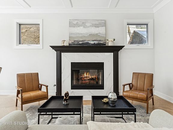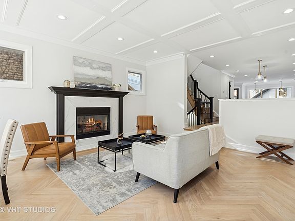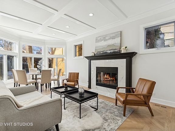 **Experience the best of Lincoln Park living** in this thoughtfully designed and newly renovated 4-bedroom, 3.5-bath single-family home, perfectly situated on a classic, tree-lined street. The desirable open floor plan showcases a professional-grade Wolf/Sub-Zero kitchen that flows seamlessly into a spacious living and dining area. Features include elegant coffered ceilings, oak flooring with herringbone inserts, contemporary millwork, and striking panoramic bay windows. Perfect for entertaining, the home also boasts a generous family room adjacent to the kitchen, with easy access to multiple outdoor spaces. The finished lower level offers rare walk-out access to a paver patio and floor-to-ceiling windows. This versatile space includes a recreation room with a quartz wet bar and beverage fridge, a massive fourth bedroom that doubles as an office or gym, a full marble bathroom, and a second laundry area. The dramatic primary suite features soaring 11'+ ceilings, custom millwork, a private balcony, organized walk-in closets, and a wood-burning fireplace with a gas starter. The luxurious stone bath includes a double vanity, a spa-like shower, and an additional laundry area. The second level is bathed in natural light from multiple skylights and includes two additional bedrooms, stunning oak flooring, and a plush secondary bathroom with marble finishes. Outdoor living abounds with two fenced-in yards and a true two-car garage featuring a massive loft space for additional storage. Ideally located, this home is within walking distance to neighborhood shops including Webster and Armitage areas, restaurants, parks (with Clover Park conveniently across the alley), and schools, including Oscar Mayer and St. Josaphat.