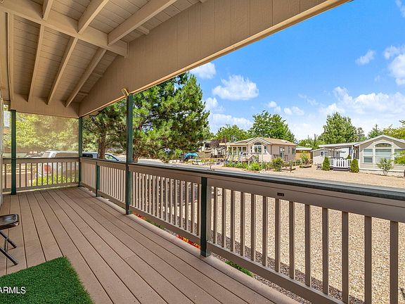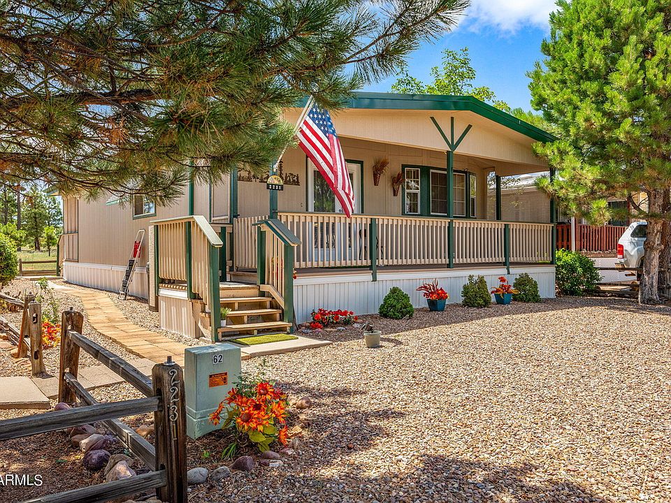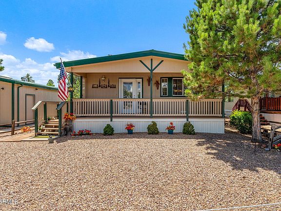 A rare find in Pinecrest Lakes- 2 bedroom home backs to National Forest Service land & on a double lot WITH a 2 car garage! The home has a spacious living room with a wood burning fireplace, larger kitchen with eating area, 2 bedrooms & inside laundry & central heat and AC. Outside there are front and rear spacious covered Trex decks, 2 large storage sheds, concrete walkways, low maintenance yard care and plenty of room for a garden! The larger storage shed has a 3/4 bath and additional laundry hook up. The private back deck offers unobstructed views of the Sitgreaves National Forest and the abundance of native wildlife that frequents the area.