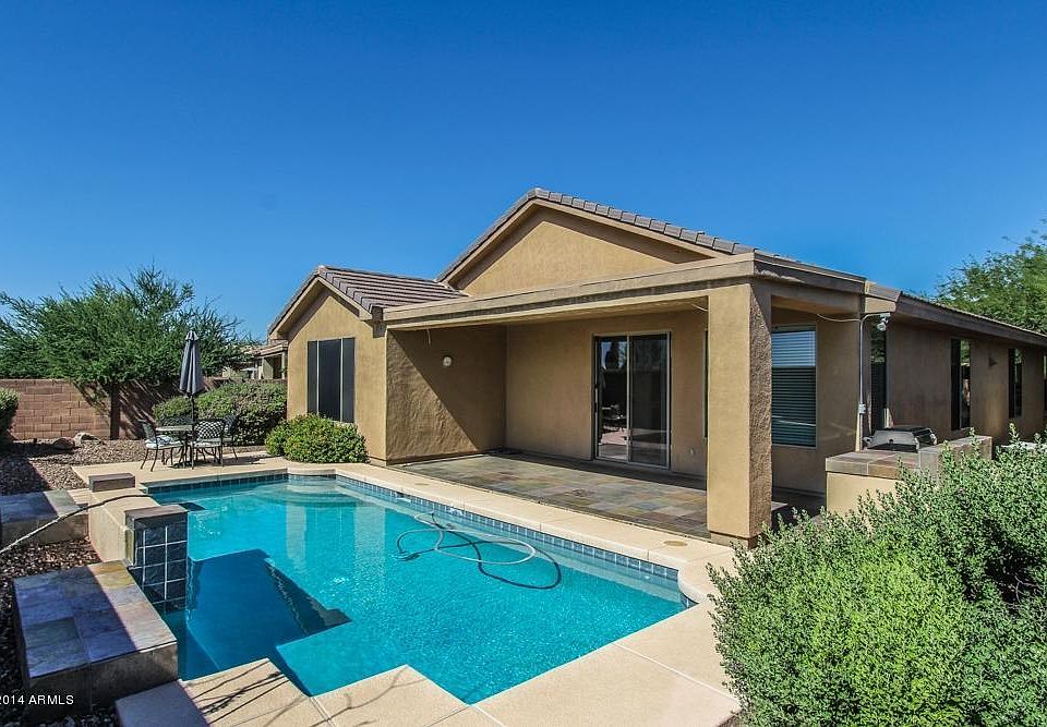 North South Exposure. Popular Telluride model with a den/office/bedroom option with French doors along with a formal dining area. Has a HEATED POOL for year round enjoyment off the relaxing and entertaining patio with slate flooring and a built in BBQ and misting system. Rare EXTENDED 4 foot GARAGE with epoxy finish for additional storage. Water softener, RO along with ceiling fans for additional comfort of the residents. Main flooring is tile with carpet in the bedrooms. Clean and ready for quick close to move in and enjoy the Arizona outdoors.