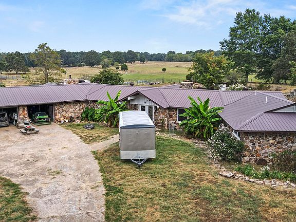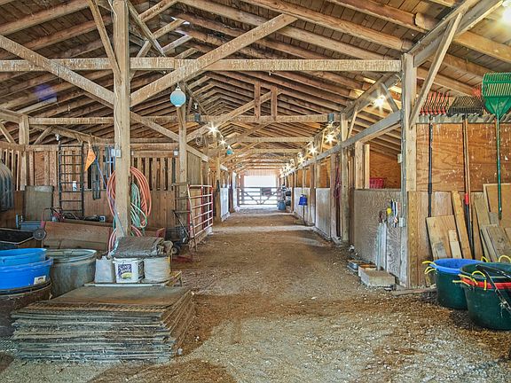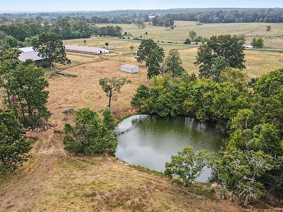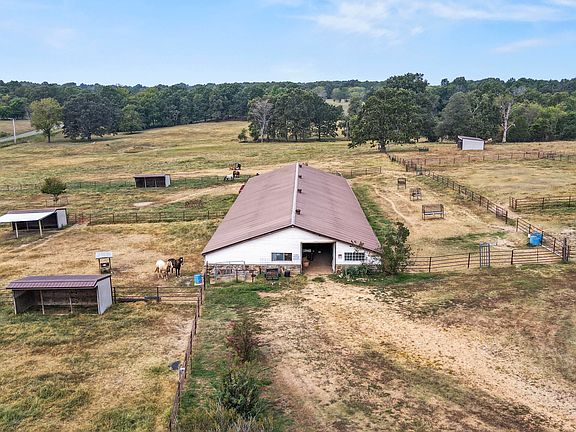 Horse Farm! Equine Facility! Missouri Cattle Ranch with spacious home.80 Acres m/l mostly open, gently rolling pasture with scattered trees and one wooded corner, 1/4 mile Highway W frontage. 3 ponds - 2 stocked. Pipe Fencing, Fencing & Cross Fenced, new fence along road basket-weave with barbed wire on top. 4 front paddocks with shelters & water, 2 hayfields.Each area has water access, pond or multiple water hydrants throughout the property.House is 3500 sqft m/l - one level with exception of slight step-down in family room.Living room with stone fireplace, wet bar, Kitchen with big kitchen bar and work space, lots of cabinets, dishwasher, disposal, compactor, oven, convection oven, electric cooktop. Dining Room, Office, Family room with beautiful stone fireplace, Mud room off garage with 1/2 bath & laundry area. 3 Bedrooms, 3 1/2 Bath - Large master suite with BIG full bath, walk-in shower, tub, walk-out porch, Large second suite with full bath, 3rd bedroom with full bath with shower. 2 furnace heat pumps.Primarily stone exterior, Metal roof, 2 car attached garage, Awesome outdoor lighting.Landscaping - banana trees, magnoliasWalk-in storm shelter, Above ground pool.Well has newer pump and casings. Asparagus bed, apple/peach/pear trees.Buildings: Horse barn 137x47 stone wallsWash RackBIG tack roomWork area with benchesMetal vet stockBird brooders space or holding pen9 - 22x11 stalls5 - 11x11 stallsLoafing stall at end of barnEnd of barn has more stalls and there is room for additional stallsFeed area with cabinetsBack paddock end of barnBreeding hitching postAlley to more paddocks30x20 Loafing shedMachine Shed pull-through with power, water and lean-tos on both sides60x80 indoor riding arena, corral, round pen and 14 ft equipment overhang.Large stone well house with storageDog Building with runs that is 1/2 for dogs, 1/2 for storageGarden shed with electric & water hydrant. **See Equipment List**
