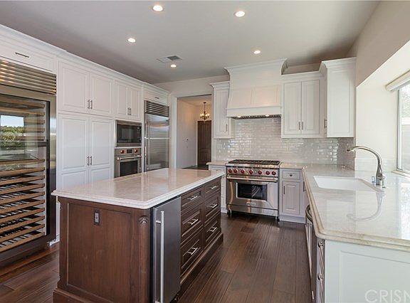 This is an amazing opportunity to live in one of Calabasass most desirable areas, Mulholland Heights on a quiet family friendly cul-de-sac with a view of an exclusive park and walking trails. This stunning one story 4 bed, 2.5 bath was recently upgraded with the finest finishes and appliances & custom cabinetry throughout. Open airy light-filled home with high ceilings and beautiful hardwood floors throughout. Two large skylights and numerous windows set the tone for a formal living room and dining room with fireplace. Gourmet chef kitchen is exposing Quartzite counter tops and island, Sub Zero 100 bottle wine fridge, Icemaker, Sub-Zero fridge, & Wolf Stove. Family room with fireplace boasting beautiful views of a newly landscaped backyard with drought tolerant planting. The Master Bedroom with dramatic vaulted ceilings, separate sitting area & fireplace, large walk-in closets with safe, & a spa-like master bath with spa tub and, all look out onto the backyard. This backyard has a Zen-like feel with a built-in BBQ, large outdoor seating, dining area, pool, & waterfall spa all controlled by a remote control system. The entire house is wired for alarm, internet, & front door security. Additional conveniences include a central vacuum system, separate laundry room, additional outside storage close to luxurious shopping, restaurants, and entertainment. Low HOA at $170. All part of highly acclaimed Las Virgenes School District. This exquisite turn-key home should not be missed.