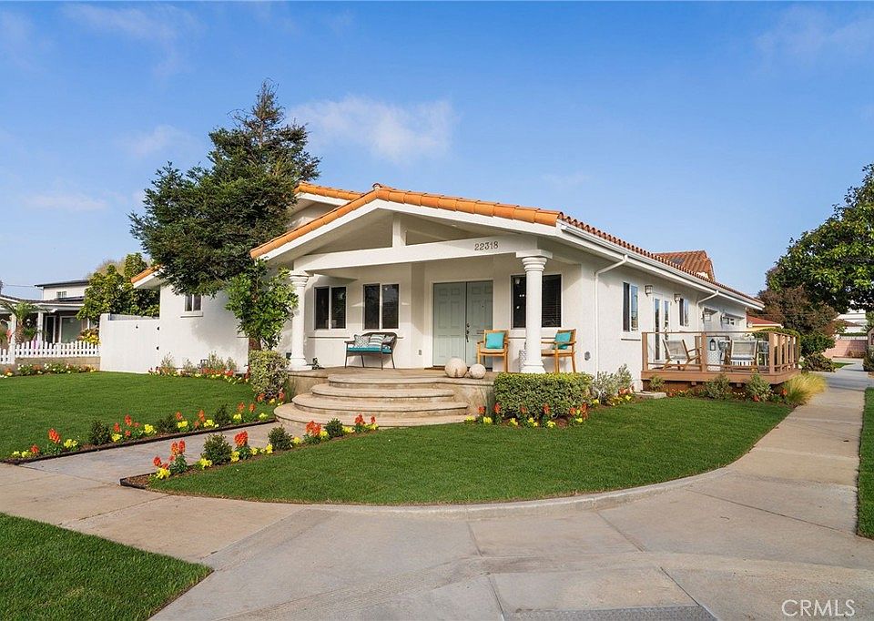 Charming and inviting, this single-level 3-bedroom, 3-bath home at 22318 Avis Court sits on an oversized corner lot within a cul-de-sac in Torrance. A welcoming front porch sets the tone for this warm and comfortable residence. Inside, the living area features a built-in media center and opens to a deck off the front of the home, perfect for morning coffee or evening sunsets. The kitchen includes a breakfast bar ideal for casual dining or conversation while cooking, along with ample cabinetry and workspace. The primary suite provides a relaxing retreat with a fireplace, dual-sink vanity, soaking tub, and separate shower, while two generously sized additional bedrooms offer flexibility for family, guests, or a home office. Outdoors, a generous backyard offers plenty of space for entertaining, outdoor dining, or simply enjoying the California sunshine. The three-car garage provides excellent storage and parking options, with potential to convert a portion or the entire space into an ADU, offering its own private entrance and small yard area—ideal for guests, extended family, or rental income opportunities. Located near top-rated schools, parks, and shopping, this home perfectly blends comfort, character, and classic South Bay charm.