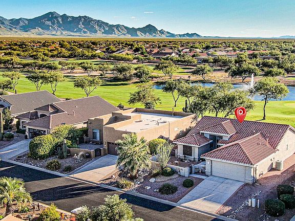 Fabulous views of mountains behind the golf course with the fountain, in the forefront, spraying plumes of water! You will find a covered and screened patio with electric screens as well as a paved patio area for outdoor dining while taking in the amazing vistas. Walking inside this beauty you will see upgrades throughout and all high-end, tastefully executed! From the unique tile floors, quartz countertops to the electric sunscreens on living room, main bedroom and den to the Putting green in the backyard, this home was designed for easy, pleasant living! A must see and then make this yours!