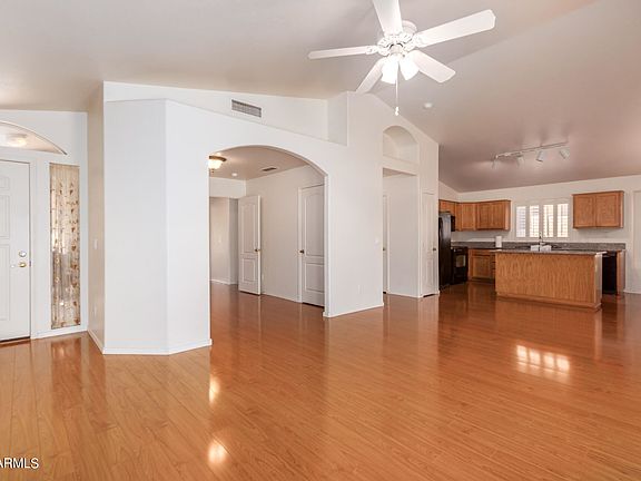 Welcome home to this lovely 4 bedroom, 2 bathroom, ready-to-move property! Located a few minutes away from shopping and freeways. Spacious open great room floor plan, vaulted ceilings, new laminate wood floors, delightful arches, soothing palette, plantation shutters in all the right places, & ceiling fans. French doors to the patio. The charming kitchen features wood cabinets, granite counters, black appliances, and an island with breakfast bar. The primary bedroom boasts soft carpet, bountiful natural light, & private bathroom. The expansive backyard enjoys a relaxing covered patio, gorgeous desert landscape, and fountain. Exterior of home painted last year. Take a tour today!