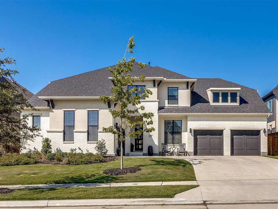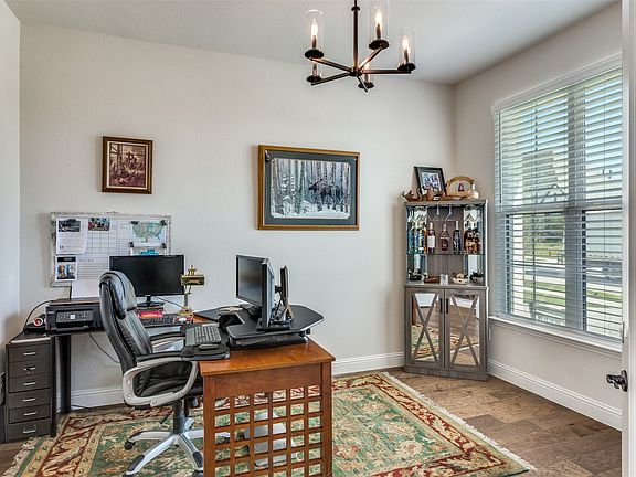Seller Relocation is Your Reward! *LIKE NEW DREES GRANTLEY PLAN in SOUGHT AFTER ALEDO ISD* This 4 bed 6 bath 3 living 2 study spacious beauty has upgrades galore! Each bed has its own en-suite bath! The grand elevation with split 3 car garage, premium exterior facade and ample parking welcome you through the custom 5 pane glass door into the spacious entry with hardwood flooring throughout. The private French Doored formal study is perfect for remote work, near the private guest ensuite. The living room has cathedral ceilings, an electric gas start fireplace w custom mantle accentuated by owner added floating bookshelves & cabinets. Two sets of electronic shaded twin slider doors lead onto the 34x10 covered patio w a gas grill connection and no neighbor behind! The chef’s eat in kitchen has a grand leathered granite island w bar seating, a stainless farm sink, 6 top gas burner stove, double oven, walk in pantry, shaker cabinets & custom backsplash. The formal dining has a great view of the green space. The oversized primary en-suite has built in cabinetry, a coffee bar, tray ceiling, slipper tub, dual sink vanity, large walk in shower and closet w custom cabinetry that leads directly into the utility room w sink and granite folding bay. The mudroom is ideal for storage and two powder baths are great for entertaining. Upstairs find the second living room w tray ceiling & large media flex room that can also serve as a gym w custom gym mat. The second office up has a built in desk w custom cabinets. Both beds up are spacious and each have their own en-suite bath & walk in closets. This entertainers delight on a 70ft lot has everything you need including owner added Culligan whole home filtration system w reverse osmosis, garage epoxy flooring w custom storage racks, and custom installed window blinds throughout!