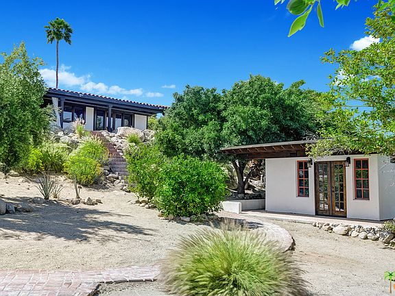 Palm Springs View House! This luxe Mediterranean charmer is nestled in the enclave of Little Tuscany - Palm Springs' version of the Hollywood Hills. Set demurely behind striking boulders and an ultra-lush desert landscape, this petite estate will make you forget all of your worries the moment you pass the gated entry and take in the intoxicating scent of your mature citrus trees. Once inside, you'll immediately head to the back of your home and open the disappearing wall of Fleetwood doors, bringing forever views across the Coachella Valley into your home. From the windmills to the jetliners and beyond, the serenity of being on top of it all will calm you as you relax in your 600sf outdoor living room. The already Instagram-famous pool is one of a kind and features hand made mosaic tiles from Mexico. Back inside, the home features a chef's kitchen, terra cotta floors, an indulgent master suite with separate sitting area and walk in closet, as well as two additional guest bedrooms. The