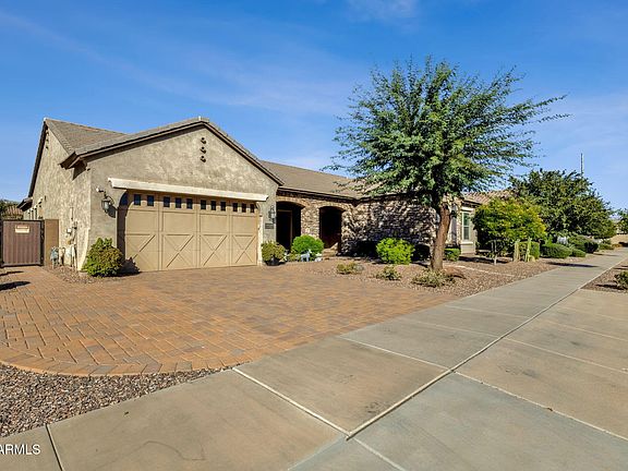 Welcome to this beautifully designed single-level home offering 3,194 sq. ft. of thoughtfully planned living space. Featuring 4 bedrooms, 3.5 baths, a den + a spacious 3 car garage, this home combines comfort, functionality, and Arizona charm. Enjoy outdoor living at its best with a sparkling heated & cooled pool featuring a tranquil water feature, a covered patio, and an additional open-air patio on an oversized lot, surrounded by single-level homes for added privacy. Inside, the smart split floor plan provides ideal separation: an ensuite bedroom in its own private wing, two additional bedrooms on the south side, and a secluded primary suite retreat. The home offers exceptional storage throughout and includes upgraded features, ask about the integrated surround sound system! Perfectly situated in a quiet location yet just minutes from Queen Creek Marketplace, restaurants, and amenities. The best of convenience and tranquility awaits!