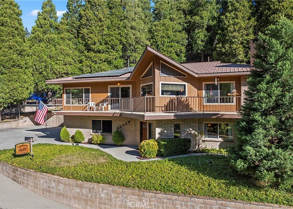 Gorgeous Mountain Home nestled in a desirable, quiet neighborhood surrounded by National Forest. This home offers great, comfortable space both inside and outside. Enjoy the newly remodeled custom kitchen with 14 inch deep cabinets and granite counters beside the beautiful living room with fireplace for cozy evenings. Nearby is a stylish, custom Home Office. The Dining Area is roomy and adjoins the living room and kitchen, completing the open concept feel and creating a perfect space for entertaining. The primary and second bedrooms are on the upper main level. The large downstairs bedroom has a fireplace and adjacent office. Each has its own bathroom. This property features a large level driveway for multiple vehicles, which can also provide RV parking, and an oversize 2 car garage with workshop. All this, a whole house generator, solar roof panels on a metal roof, and a stair glide to ride up and down the stairs. So many amenities! Great for working remotely! Come and see for yourself and prepare to be amazed!