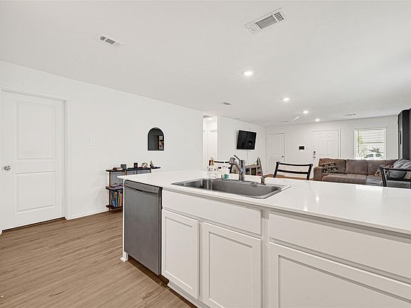 This single-story home has a comfortable layout with three bedrooms and a living area. The front door leads into the living room, which flows into the kitchen and dining area in an open concept layout. Two bedrooms share a hall bathroom at the front of the home, while tucked into the back corner is the primary suite with a full bathroom and walk-in closet.