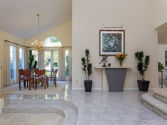 This Mulholland Heights JM Peters home feels like Lake Arrowhead in Calabasas, with towering Sequoia trees in the back yard providing privacy, seclusion, and a woodsy feel. Upon entering you notice the light, bright, and open feeling of this house with high ceilings, French doors and windows, neutral color palette and well maintained condition. There is an oversized living room with fireplace that connects to a large formal dining area, both great for entertaining. The chef's kitchen is enormous with a center island and massive counter space as well as an abundance of cabinets. The new stainless appliances feature Sub Zero and Thermador, with a 5 burner cooktop and double oven. The kitchen opens to a large family room with a cozy fireplace and built in entertainment center, a great space for casual relaxing. Upstairs there are 4 bedrooms, 1 with bath and 1 BR/office downstairs with pvt bath. The master is large with vaulted ceilings and a built in, and has a private deck that opens to the back yard. Master bath is light and bright with a large shower, tub, and dual vanities. The other bedrooms are good sized with 1 featuring additional built in cabinets, and all BRs have built-in closets. The private yard is wonderful for entertaining with a grey bottom pool and spa accented by detailed stone walls, decking, walk ways and seating areas. There is also a small grassy area, BBQ center, and an abundance of mature trees, shrubs, and bushes. This house has it all!