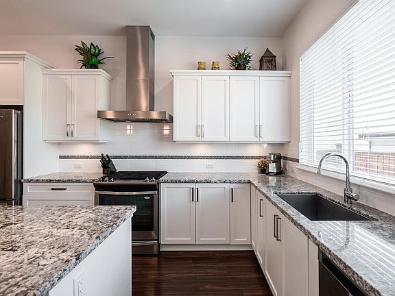 Gas fireplaceLight-filled kitchenGranite countertopsStainless appliancesGas rangeCentral islandVaulted primary suite