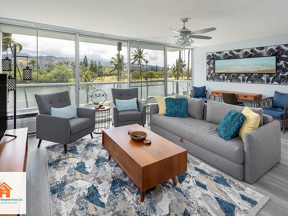 You will love the luxury this amazing retreat offers with golf course, canal, and mountain views from the comforts of your home! This extra large one bedroom end apartment offers plenty of natural lighting and was completely remodeled this year with thoughtful upgrades and finishes: Stainless steel appliances, luxury vinyl flooring, quartz countertops, new kitchen and bathroom fixtures, even the mirrors have lights and built-in technology. The large living area and extra half bathroom makes this apartment ideal to entertain guests or enjoy all to yourself. There is a large window AC unit to cool the home if needed, however, the corner unit allows for the cool trade winds to blow through most days. With a walk score of 90 out of 100, it's conveniently located near schools, bus lines, beaches, shopping, and restaurants. This home is available now and ready for you to occupy. Move right in as it is fully furnished down to the kitchenware, towels, and linens.