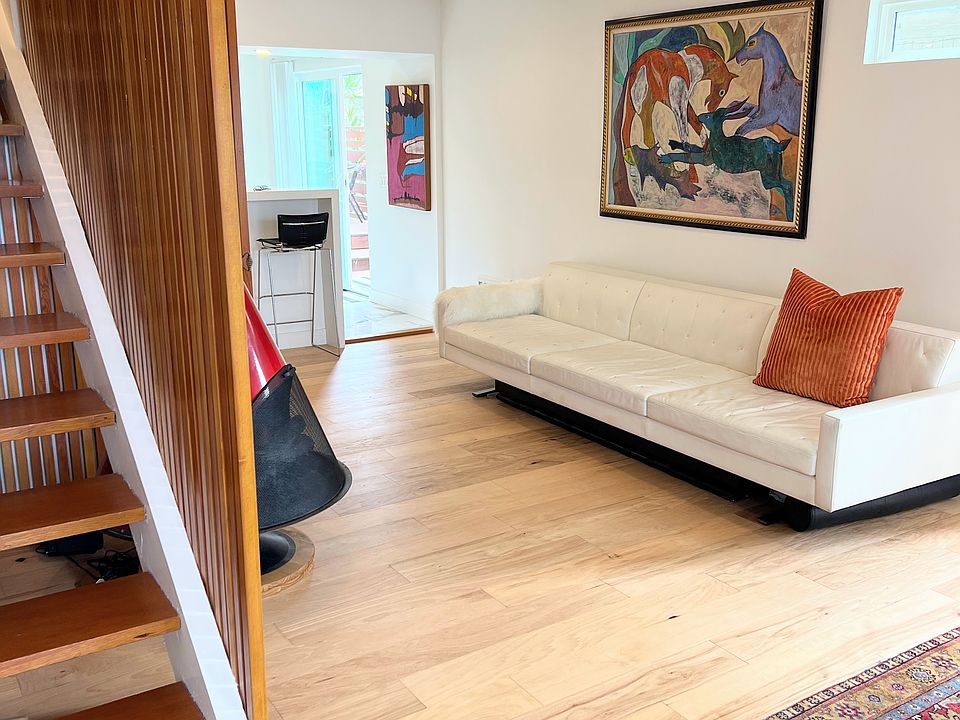 Hickory wood flooring throughout, eat-in kitchen with quartz counters, waterfall style breakfast bar, SS appliances including dishwasher, range, built-in microwave, and high-end refrigerator. Custom reeded wood staircase and scene-steeling Vintage Modern fireplace in the living room opening up to private patios -- perfect for BBQs and entertaining. Downstairs features living room, kitchen, dining, full bathroom with in-unit washer/dryer and second bedroom/office with its own exterior entrance off the patio. Upstairs you will find the primary bedroom with two large mirrored closets, ceiling fan and 8' sliding door to oversized (170 sqft) balcony with West-facing peak ocean view for lounging and beautiful sunsets. Main bathroom with new tub/shower and large vanity, extra storage in hall.