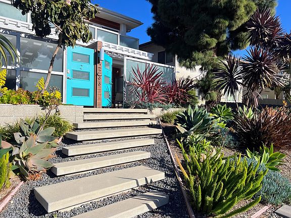 Rarely available, stylish and spacious Mid-Century Modern apartment in architecturally stunning complex. Luxury unit in Cardiff-by-the-Sea's coveted Walking District just 3 blocks from the ocean and village. Fall in love with this fully renovated and upgraded, dog friendly home. 2-story, 2BR/2BA, ultra modern townhouse-style apartment has an indoor-outdoor feel with large (400 sqft) private, glass-walled entrance patio, full length side patio off living, dining and second bedroom and a view-balcony off the upstairs primary bedroom.