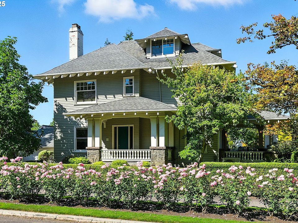 Historic elegance with period charm and modern touches in this amazing home by renowned architect Emil Schacht, known as the ML Kline House. Many original details including gorgeous hardwood flooring with walnut inlay, a classic dining room with period built-ins, box beamed ceilings, and built-in window benches. There are plenty of spacious entertaining areas and an excellent floorplan, including outstanding separation of spaces and privacy. There is a large Primary on the 2nd floor with abundant natural light and a large walk in closet, adjacent to 2 additional large bedrooms. This home also has an amazing light filled office/craft space with wrap around windows. The top floor features additional bedrooms/flex spaces plus a full bath. The Lower level has an expansive bonus space with built-ins, and an additional bedroom suite with new bath. Updated kitchen with butler's pantry and light filled breakfast area, leading to a patio overlooking one of the most breathtaking outdoor areas you will find, originally designed by Michael Schultz. The large, flat yard has spacious entertaining spaces, fountain, abundant grass and landscaping specifically designed to continue the timeless character of this property - including Margarite pink roses and an iconic, historical Japanese Maple. Featuring an off-street 2 car garage with spacious driveway for modern convenience, yet exterior character complemented by covered porches and corbelled rafters which complete the architectural charm of this classic Portland Heights home. The premier corner location provides privacy and space, yet just blocks away from Ainsworth Elementary and nearby amenities. [Home Energy Score = 1. HES Report at https://rpt.greenbuildingregistry.com/hes/OR10239593]