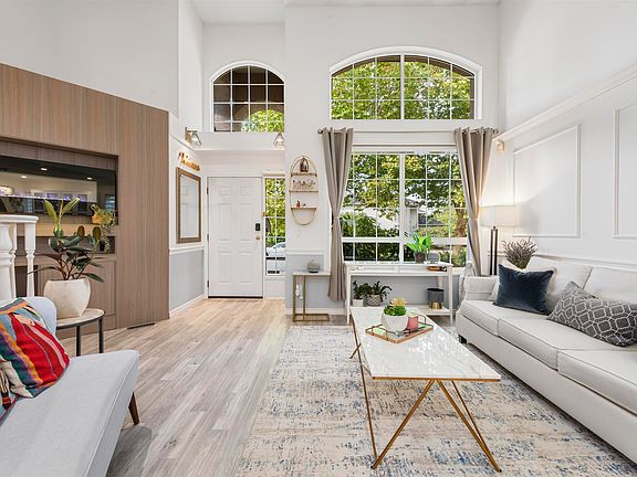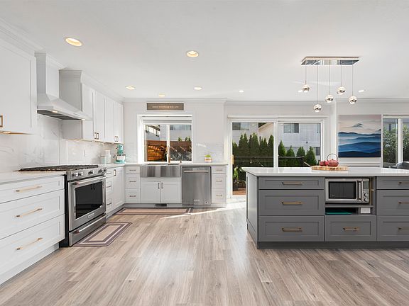 Dream kitchenTwo-tone cabinetryStainless steel appliancesGas rangeUpgraded lightingVaulted ceilingsElegant feature fireplace