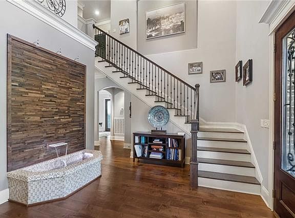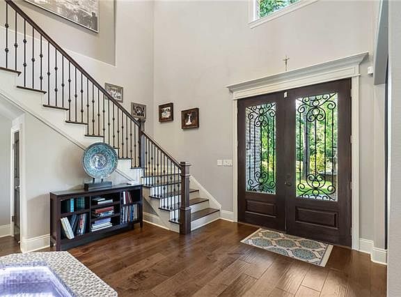 WOW! This house has it all. Downstairs has welcoming fountain in the foyer, large den with fireplace, beverage bar and a game room perfect for a pool table. Kitchen has custom maple cabinets, 6 burner gas stove, double ovens, warming tray, tons of cabinets and a large island. Upstairs large bedrooms plus a huge playroom for the kids. Outside oasis. large covered patio, a pool to die for(1 year old) all overlooking the pond. One garage has been turned into your own personal gym. Too much to list..Must see.