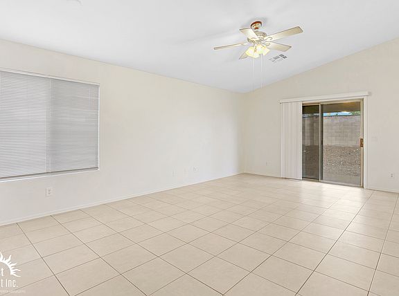 Comfortable 3Bdm 2Ba Home in Sun City! Spacious open-concept layout showcases neutral tile flooring, a ceiling fan for added comfort, and sliding glass access to the backyard for effortless indoor-outdoor living. The open flow leads into a well-appointed kitchen with generous cabinetry, expansive counters, and a functional breakfast bar overlooking the main living space. Black appliances and a double sink complete the setup. Cozy sleeping quarters include plush carpeting, modern ceiling fan lighting, dual windows for natural brightness, and a wall-to-wall sliding closet for ample storage. The updated bath features a spotless shower-tub combo with fresh white tile, built-in shelving, and a curved curtain rod for added space. A dedicated laundry room with washer and dryer connections adds convenience and practicality. Outside, a low-maintenance yard awaits with a covered patio and built-in fire pit ideal for entertaining or relaxing under the Arizona sky. This property allows self guided viewing without an appointment. Contact for details.