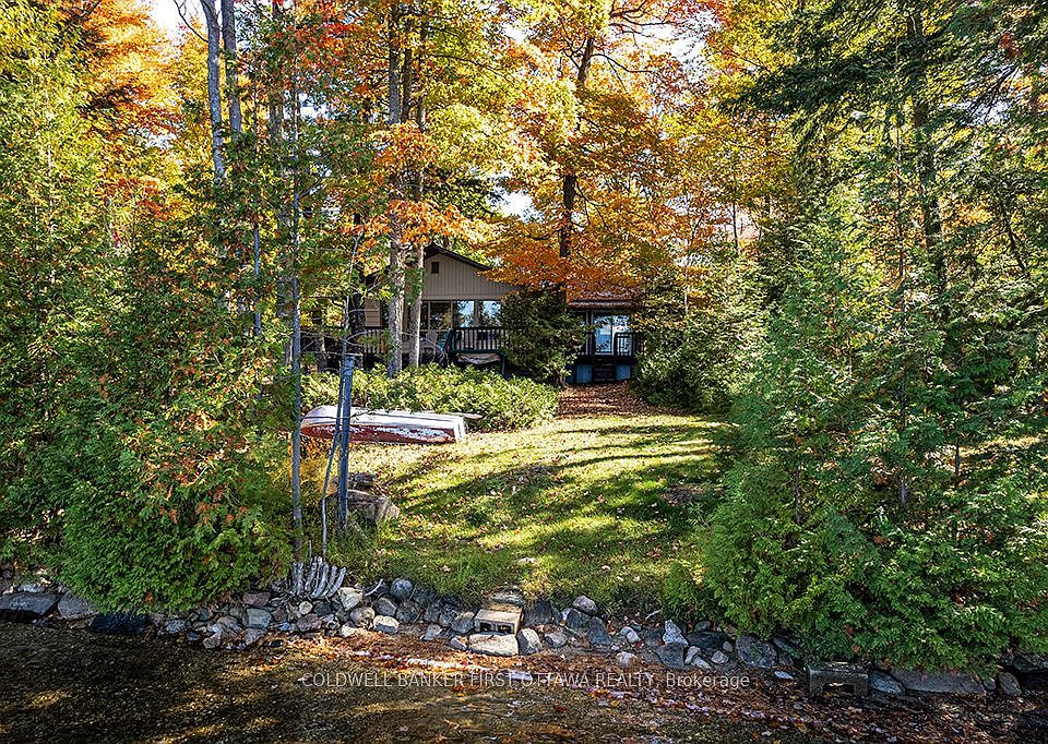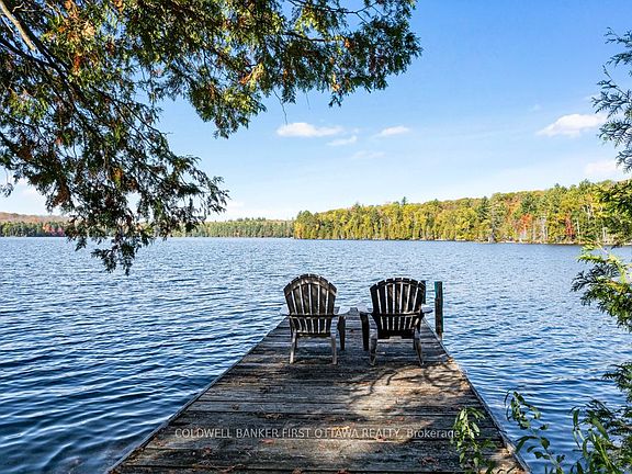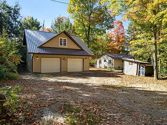 On tranquil Grindstone Lake surrounded by Crown Land, welcoming bungalow full of comforts for your all-year home or summer retreat and winter getaway. Facing west, enjoy evenings watching glorious sunsets over the lake. You also have large detached garage-workshop with finished loft for extra living space. The well-maintained bungalow flows with natural light and panoramic lake views. Flooring throughout is hardwood & softwood. Spacious sunny living room wall of windows with the most amazing, mesmerizing, lake views. Living room also has cozy warm Pacific Energy woodstove. Dining room open to both living room and kitchen with attractive wood beams along 8' high ceiling. Wonderfully efficient kitchen offers wrap-around prep space and cabinetry; undercounter lighting, propane stove with centre grill and 2022 Bosch dishwasher. Flex room currently has floor to ceiling storage cabinets, room could also be a den. Family room will become your favourite space with its lake views and propane fireplace stove. Two sets of patio doors open to expansive wrap-about deck for lounging and BBQ gatherings. Two bedrooms and 3-pc bathroom. Upgrades include central air 2024 and metal roof 2020. Propane furnace 2010. Fully insulated basement, accessed by outside door, has utility and workshop areas plus laundry centre. The detached insulated 2005 garage-workshop has 100 amps and big finished loft with 8' ceiling height, lots of windows and space for games and overnight guests. Garage metal roof 2023. The 105' of waterfront is sandy, rocky and clear; great for kids as it's shallow and gradually gets deeper for swimming. Dock and, you also have place to launch small boat. Or, lake's public boat launch 2 km away. Waterfront owned by township with owner having free access. If wanted, owner has option to purchase the waterfront from township. Hi-speed & cell service. Private road $300/yr for maintenance & snowplowing. 15 mins to Plevna for groceries and amenities or 50 mins to Sharbot Lake.