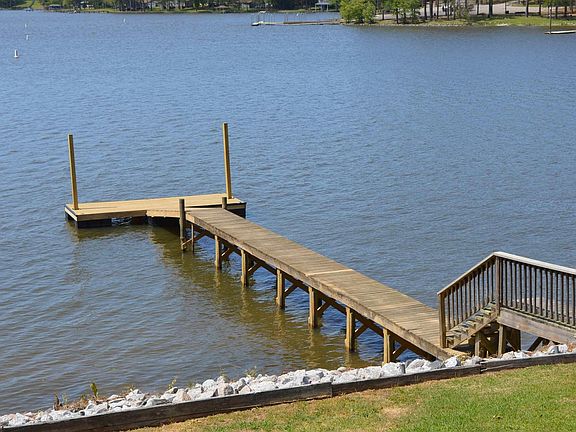 Beautiful sunsets are a bonus of this 5 Bedroom, 3 Bath home on an elevated lot with big water view. Exterior features a front porch, a screened porch, deck, New dock, brick-paved patio, workshop, attached 3-car garage and large detached boat house/storage building. Interior features a large great room with an masonry inset wood stove; recently upgraded kitchen with custom cabinets and granite countertops; large master suite with his & hers closets; sitting room; office; finished bonus room with large walk-in closet and waterfront balcony; and in-law suite with private entrance. Hardwood floors and ceiling fans throughout.