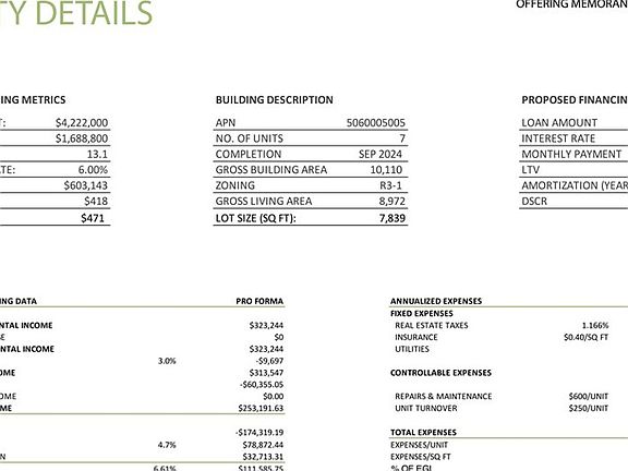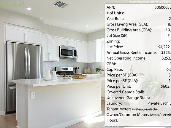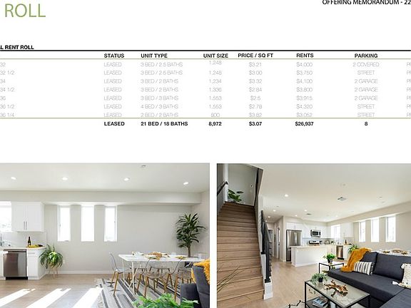 This non-rent-controlled luxury complex is comprised of three duplexes, totaling seven new construction townhomes, each with private laundry rooms and parking for select units. The layouts are very functional and desirable among renters. Each unit is equipped with separate meters for water, gas and solar power electricity, as well as an owner’s common area electric meter for exterior lighting and common area water meter for servicing and landscape irrigation. The property is completed with drought tolerant landscaping, as well as energy efficient building materials, Solar, appliances, and fixtures presenting the buyer with a fully warrantied, low maintenance, environmentally friendly property.