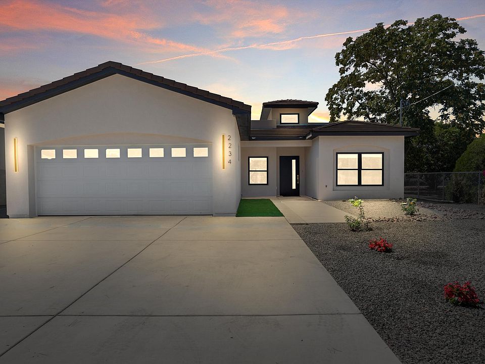 Chic contemporary custom home in the heart of the South Valley! Nestled on a spacious 1/3-acre lot with custom gate and side yard access. Step into soaring 15-ft ceilings that welcome you into an open floorplan designed for entertaining. The gourmet kitchen offers soft-close custom cabinets and a large island for gatherings. Featuring 4 generous bedrooms, the layout provides privacy while maintaining inviting common spaces. The luxurious primary suite boasts a spa-like bath with tub, separate shower, and walk-in closet.